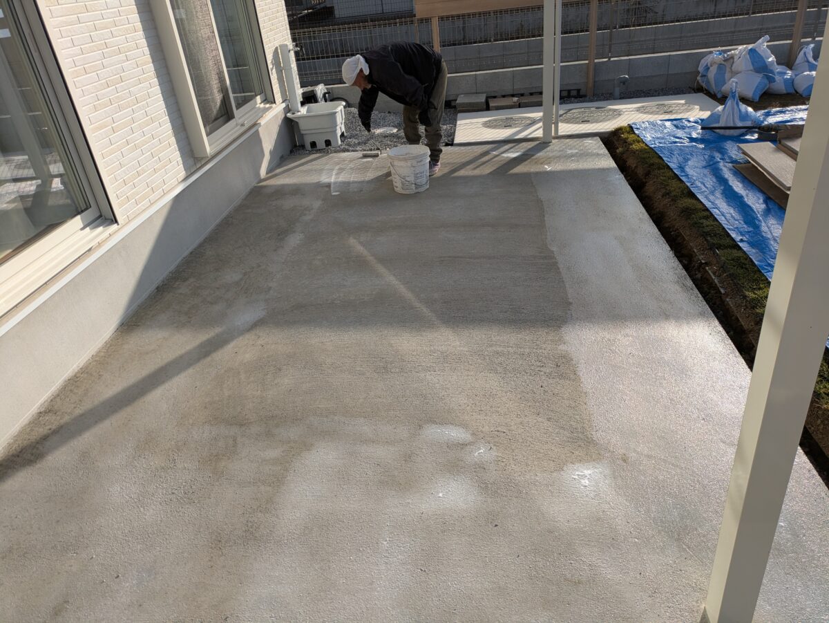 下地コンクリートに接着剤の密着性を高めるためのプライマーを塗っています。