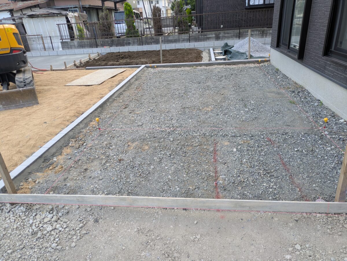 物置下と駐車場の土間コンクリートが完成した、埼玉県羽生市内K様宅新築エクステリア工事。