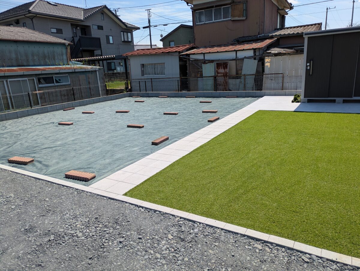 白の見切りや通路のインターロッキングと緑の人工芝が、メリハリの利いたコントラストに仕上がりました。
